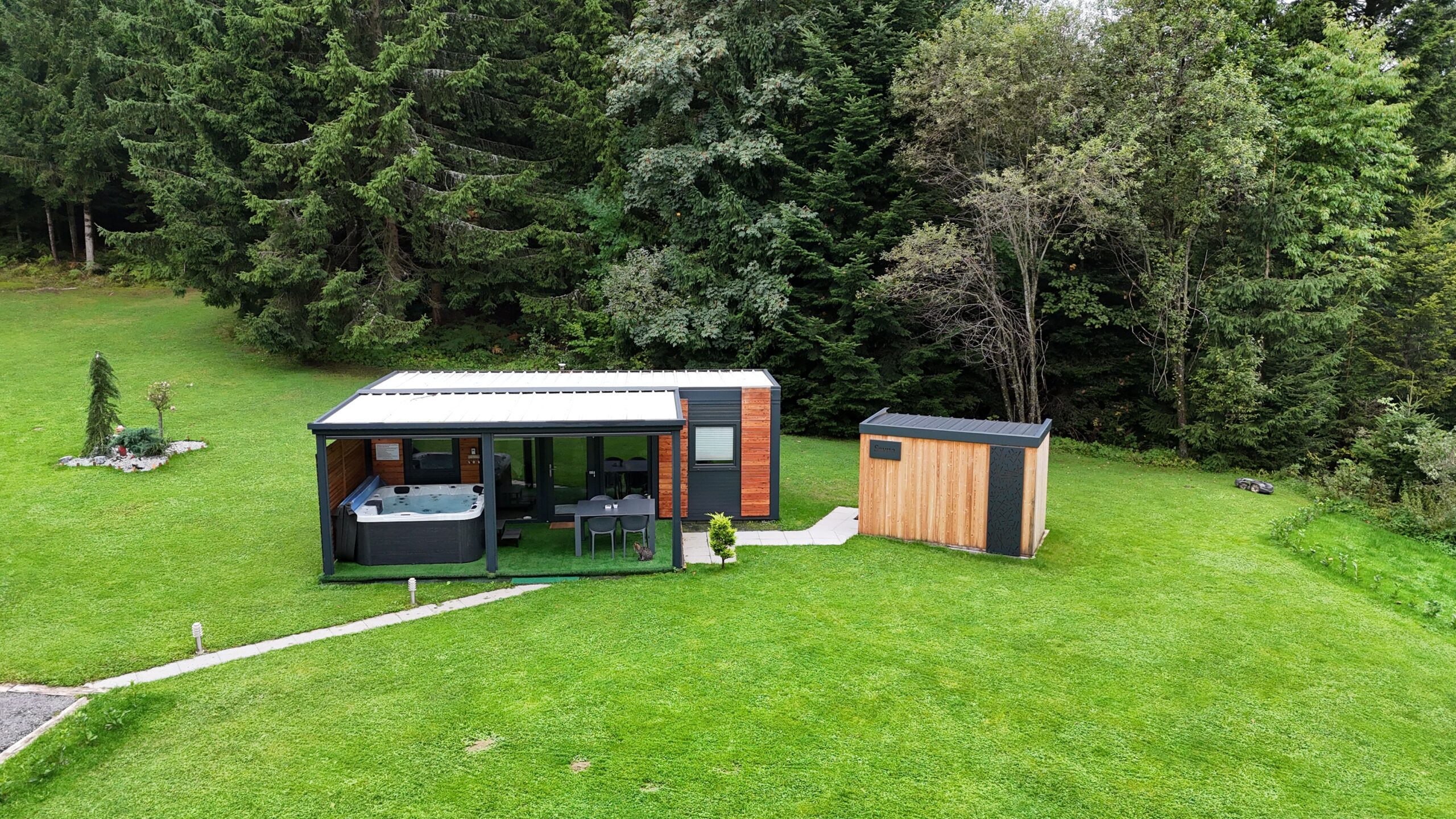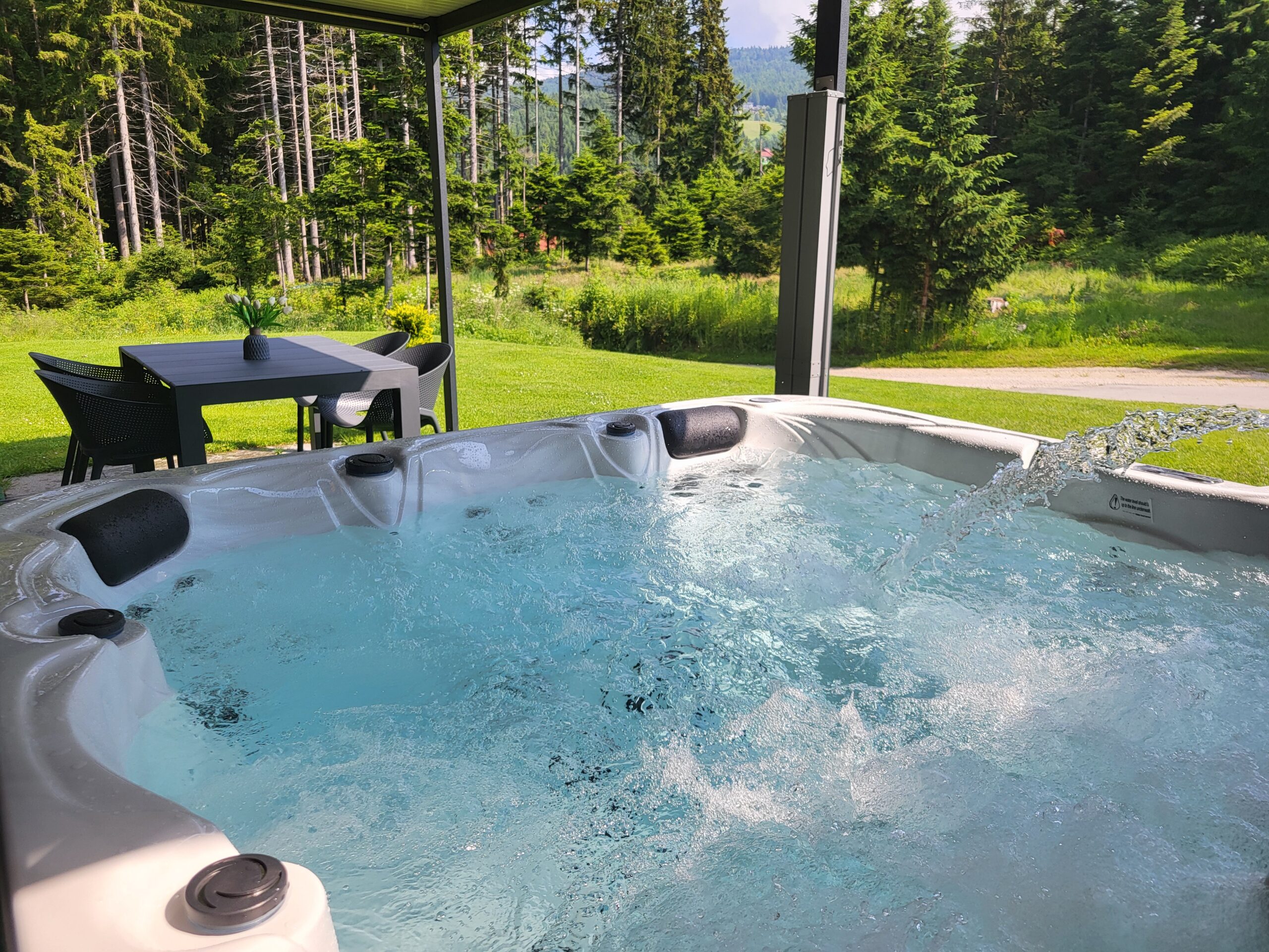 Na veliki pokriti terasi je jacuzzi, ki je v uporabi skozi vso leto, nekaj korakov stran pa savna. Dodatno je na voljo prostor za žar.